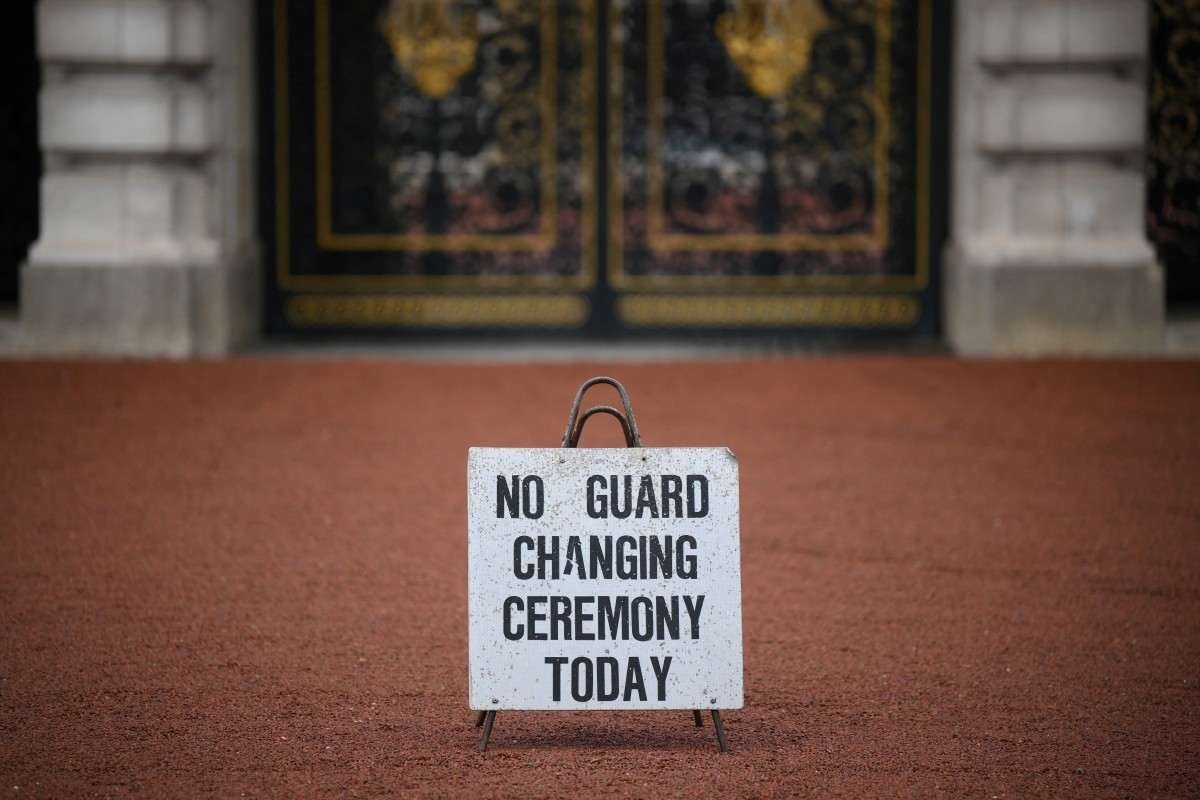 Uma placa com os dizeres "Nenhuma cerimônia de troca da guarda hoje" é exibida no pátio do palácio de Buckingham, no centro de Londres, em 8 de setembro de 2022. - Os medos aumentaram em 8 de setembro de 2022 para a rainha Elizabeth II depois que o Palácio de Buckingham disse que seus médicos estavam " preocupado" com sua saúde e recomendou que ela permanecesse sob supervisão médica. A chefe de Estado de 96 anos - a monarca mais antiga da Grã-Bretanha - tem sido perseguida por problemas de saúde desde outubro passado que a deixaram com dificuldades para andar e ficar de pé.Daniel LEAL/AFP